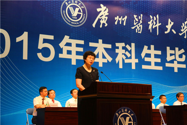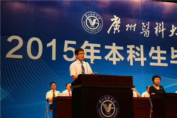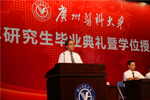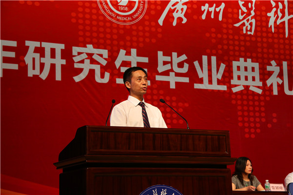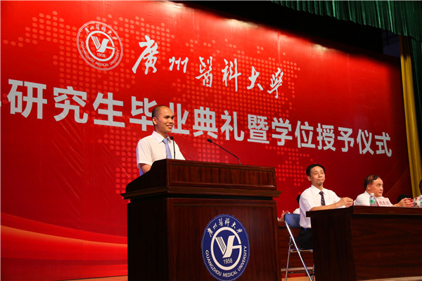 校长王新华在讲话中希望毕业生们要做个有“心”人——希望同学们继续弘扬广医人精神,要有脚踏实地的恒心,要有不卑不亢的信心,要有爱国奉献的责任心。