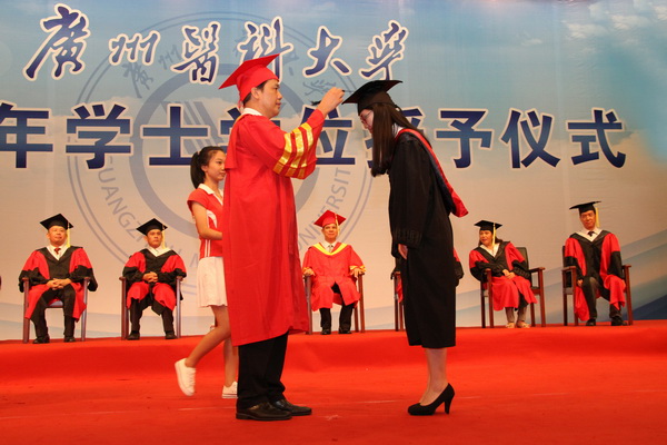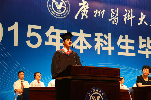 在讲话中,校长王新华勉励毕业生发扬不卑不亢的精神,他说:“我们虽然不是出身名门,但决不自卑。要弘扬广医人不甘落后,奋发直追的‘傲骨’之气”。王校长引用歌曲season in the sun, i have a dream,you raise me up,凭歌寄意激励同学们。