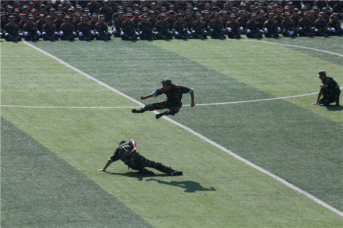 分列式表演精彩纷呈。2016级新生组成8个队列方阵依次接受检阅,他们精神抖擞、意气风发,嘹亮的口号声响彻整个体育场。经过15天军训历练,同学们以挺拔的军姿、铿锵的步伐展现了自身的精神风貌。随后进行的擒敌拳、反恐救护等军事表演气势如虹、震撼人心。