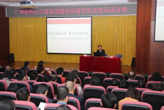 李伟章副局长详细讲解了广州市和番禺区检察机关查办的部分职务犯罪案件的情况,相关职务犯罪的个案剖析及商业贿赂潜规则的特点与危害,导致职务犯罪的若干认识误区,并通过播放相关职务犯罪人员视频现身说法。报告结合发生在高校及医院职务犯罪的典型案例,剖析国家公职人员的特点和形势,分析职务犯罪的原因和危害及其警示、启示,有针对性地提出了预防职务犯罪的对策。