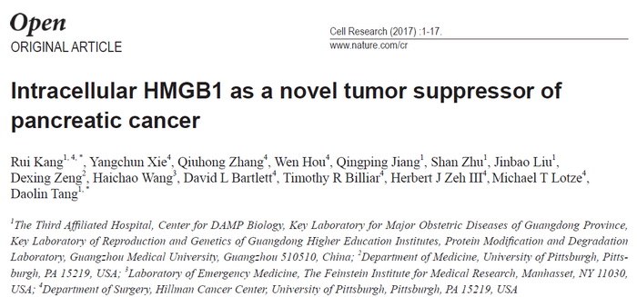 近日,伟德国际附三院唐道林博士课题组发现内源性的高迁移率族蛋白1(HMGB1)是胰腺肿瘤的新型抑癌基因,这一研究成果公布在4月4日出版的Cell Research杂志上。Cell Research是自然集团子刊,全球细胞生物学领域的一线杂志。