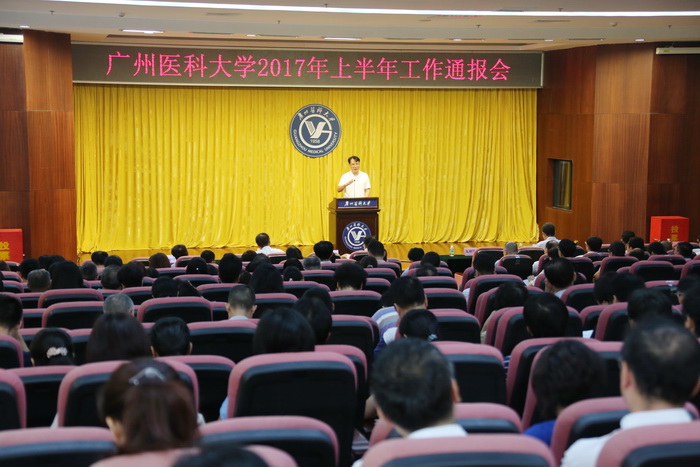 王校长从番禺校区二期建设、高水平大学建设、教育教学改革、学科建设、科技创新、人事工作、学生工作、国内外合作交流、附属医院、内部管理、党的建设和校园文化建设十一个方面通报了上半年的工作,并强调了下半年的工作重点:全面推进高水平大学建设,加快推进番禺校区二期建设,持续开展“管理水平提升年”和“医院建设推进年”工作,继续加强教育教学改革、学科建设与科学研究、附属医院工作、党建和思政工作。