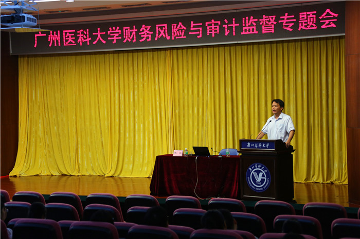 9月13日上午,学校在番禺校区召开财务风险与审计监督专题会议,王新华校长主持会议并讲话,广东省审计厅教科文审计处处长林红做了题为《“放管服”背景下的高校审计监督与风险防控》的讲座,学校审计处处长陈怡璇通报了广东省审计厅对学校高水平大学建设专项资金审计的情况。各直属附属医院分管审计、科研工作的领导,各二级学院的有关领导,学校和直属附属医院监察、审计、财务、科研、采购、设备等部门的人员,以及2012年以来立项的部分在研科研项目负责人等共260多人参加了会议。
