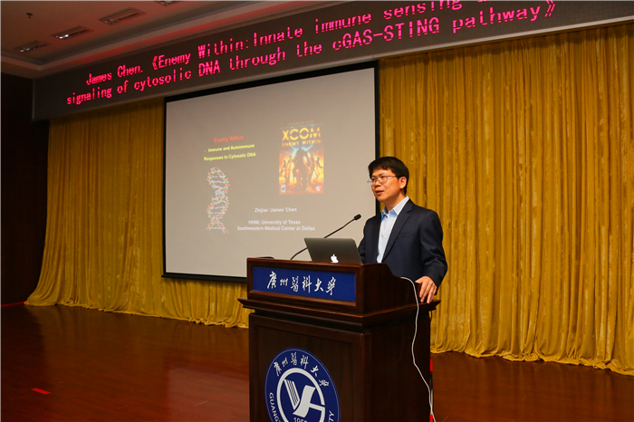 11月13日上午,美国国家科学院院士陈志坚教授到伟德国际番禺校区,带来了一场题为“Enemy Within: Innate immune sensing and signaling of cytosolic DNA through the cGAS-STING pathway”的学术报告。讲座由霍夫曼免疫研究所承办,副校长刘金保教授、名誉所长霍夫曼教授、多米尼克教授、焦仁杰教授等师生400多人到场聆听,彭涛教授主持讲座。
