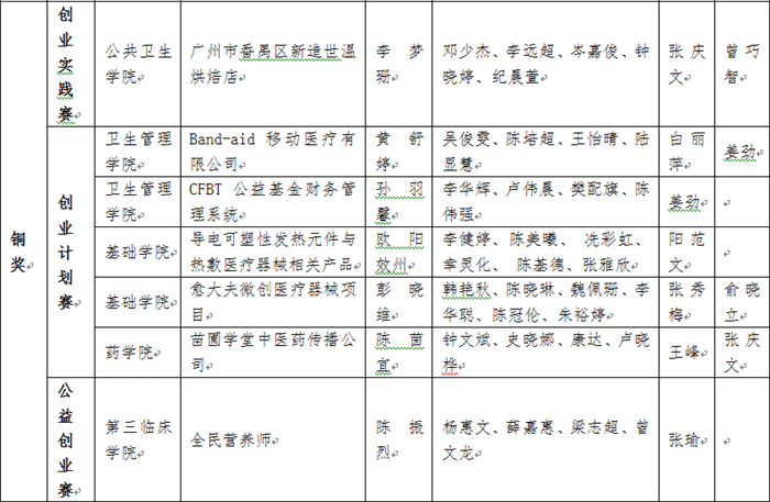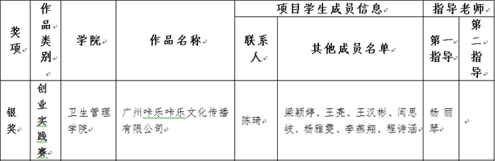 5月25日至27日,由团省委、省教育厅、省人社厅、省科技厅、省科协、省学联等单位主办得"挑战杯•创青春广东大学生创业大赛"终审决赛在华南理工大学五山校区举行。由校团委推荐的8支参赛团队获奖,其中卫生管理学院杨丽琴老师指导的“广州咔乐咔乐文化传播有限公司”获得银奖。