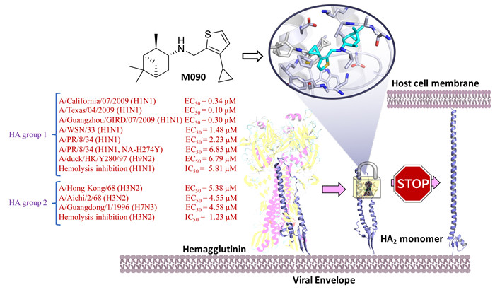流感是威胁人类健康的重大呼吸系统疾病,尤其是随着流感病毒变异,病毒对目前最主要的一类抗流感药物神经氨酸酶抑制剂(达菲为代表)已出现愈发严重的耐药性,迫切需要新的抗流感药物。该研究团队历时五年,发现了可克服金刚烷胺及达菲耐药株的新型抗流感药物候选物M090。深入的作用机制研究表明,M090作用于流感血凝素蛋白(HA)的一个全新保守结合位点,可抑制HA蛋白在病毒介导膜融合过程中的构象改变,从而抑制病毒进入宿主细胞,具有广谱的防治流感的作用。本研究为新的流感病毒HA抑制剂的设计提供了全新的活性位点,为新型广谱抗流感药物研发提供了基础。