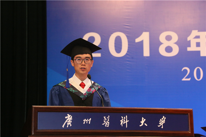 曹翼同学深情回忆了这三年“难忘的金色校园时光”,三年时光见证了广医的蜕变与腾飞,见证了同学们的成长,也彰显了“我们的未来”。“我们”为广医取得的骄人成绩感到无比自豪,为母校的蜕变腾飞感到由衷高兴。研究生的经历让“我们”收获了逐渐成熟的思想,懂得了责任和担当,赋予了未来披荆斩棘、一往无前的勇气。曹翼同学表达了对母校、对老师、对亲人朋友的衷心感谢和祝福,未来将用勤奋努力、扎实工作为祖国奉献、为母校争光。