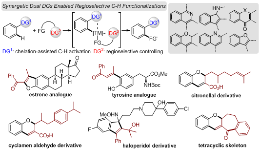 杂环化合物作为自然界分子基本结构单元,一直是药物研发领域关注的热点。然而,如何发展绿色、高效的合成策略用于复杂杂环分子骨架的快速构建及结构修饰是药物化学家亟需解决的难题。针对这一现状,伟德国际药学院引进人才、广东省“杰青”获得者易伟教授联合周志副研究员、高辉教授自2018年以来,利用过渡金属催化的C-H键官能团化反应,先后实现了喹啉(Org. Lett. 2018, 20, 566, IF=6.49; Org. Chem. Front. 2018, 5, 1713, IF=5.46)、茚胺(Org. Lett. 2018, 20, 182, IF=6.49)、苯并呋喃(Adv. Synth. Catal. 2018, 360, 2470, IF=5.12)、喹诺酮(Org. Lett. 2018, 20, 1893, IF=6.49)、苯并吡喃(Org. Lett. 2018, 20, 3892, IF=6.49)等多种杂环骨架的一步构建,并顺利将这一合成方法应用于多个复杂天然产物及药物分子的后期结构修饰和改造,体现出该策略的步骤经济性及合成高效性。
