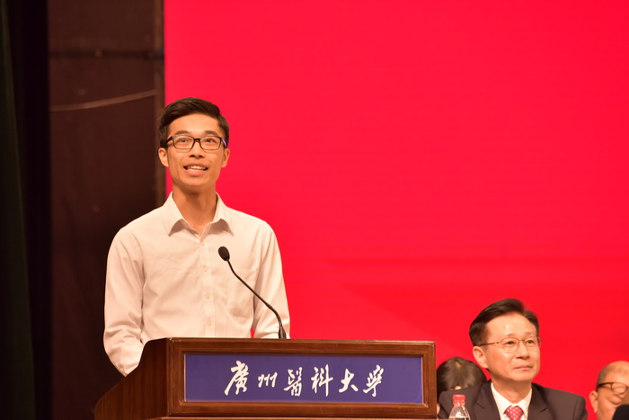 学生代表、南山学院2016级黄浚峰同学代表广医学子郑重承诺:一定要沿着前辈奋斗的足迹,传承广医人精神、南山风格、抗非精神,肩负起发展广医、壮大广医的历史重任。