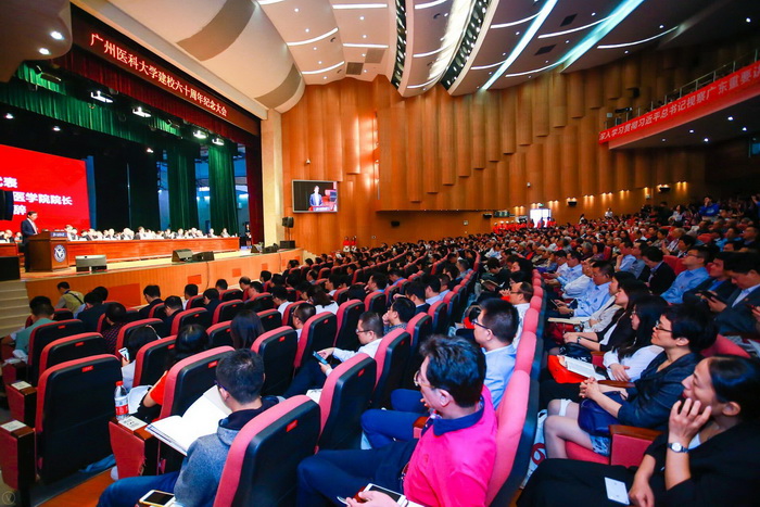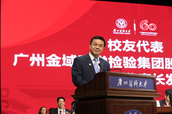 校友代表、广州金域医学检验集团股份有限公司梁耀铭董事长深情回顾了自己从一名青涩的医学生,成长为开创国内第三方医学检验先河优秀管理者的成长经历。他表示,在未来的日子里,将继续传承与弘扬广医人精神,为实现全民健康的宏伟目标努力奋斗,报答母校、报恩社会、报效祖国。