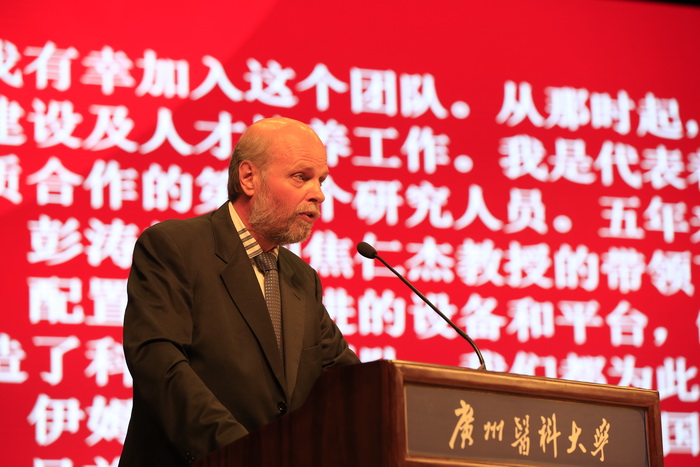 外宾代表、法国国家科学研究中心终身教授多米尼克•弗兰登先生致辞,回顾了中-法霍夫曼免疫研究所的筹建之路,以及在这五年里所取得的各项成果,向中国、广东省、广州市开放的思维和博大的胸怀,以及伟德国际英国的全力支持致以诚挚谢意,同时祝愿这种良好的合作关系使学校、学生受益的同时,能促进各自国家的发展与进步。