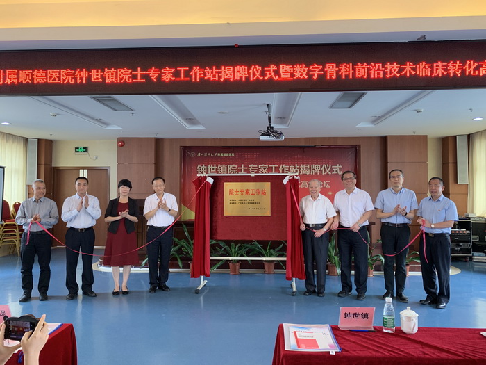 中国工程院钟世镇院士、南方医科大学欧阳钧教授,佛山市卫健局谭光明调研员、顺德区招霞红副区长、乐从镇冼英伟镇长、乐从镇卫计局崔兆林常务副局长,伟德国际英国刘金保副校长、附属顺德医院王治伟院长等共同为工作站揭牌
