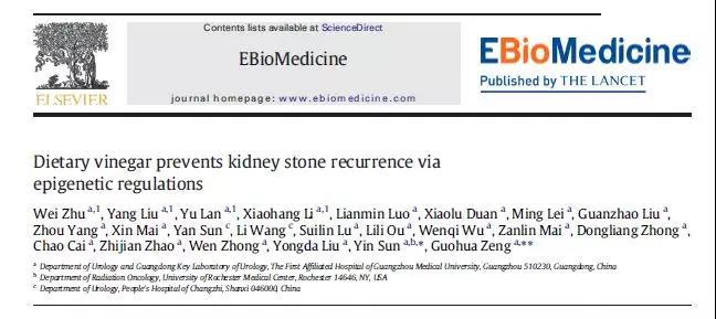 近日,曾国华教授团队在《柳叶刀》杂志旗下子刊EBioMedicine发表了题为Dietaryvinegar prevents kidney stone recurrence via epigenetic regulations的研究论文,全方位的阐述了陈醋抑制泌尿系结石形成的分子机制。