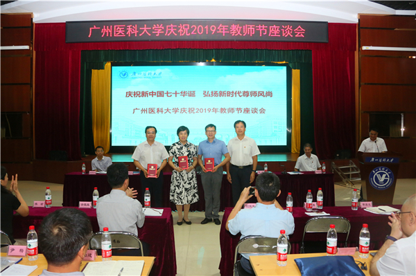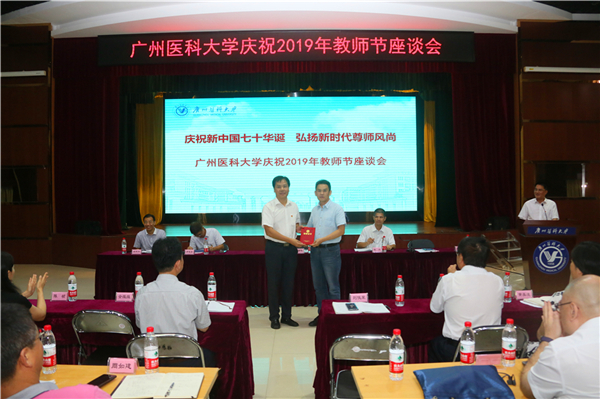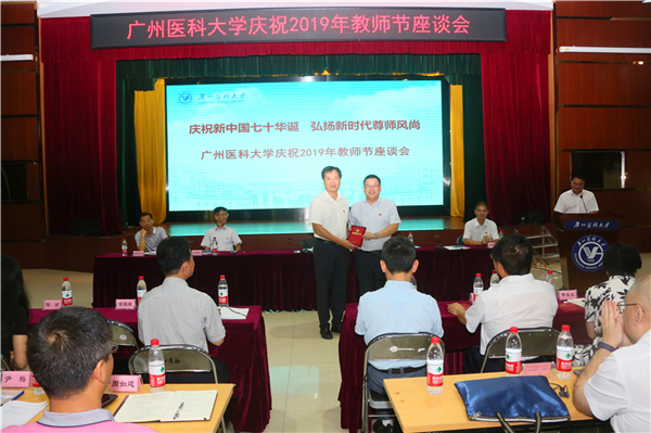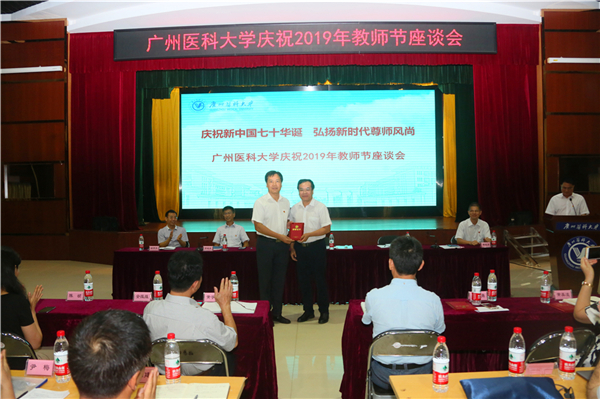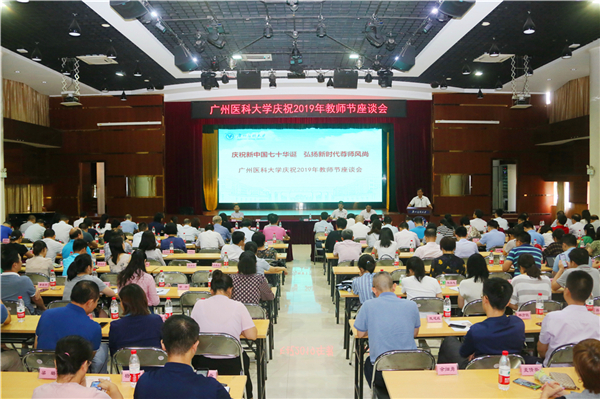广医在线讯 庆祝新中国七十华诞,弘扬新时代尊师风尚。在第35个教师节前夕,学校于9月9日在番禺校区举行2019年教师节座谈会。校领导王新华、陈杰、罗健东、黄健清、胡丙杰,教师代表,以及各学院、附属医院、职能部门负责人参加会议。副校长黄健清主持会议。