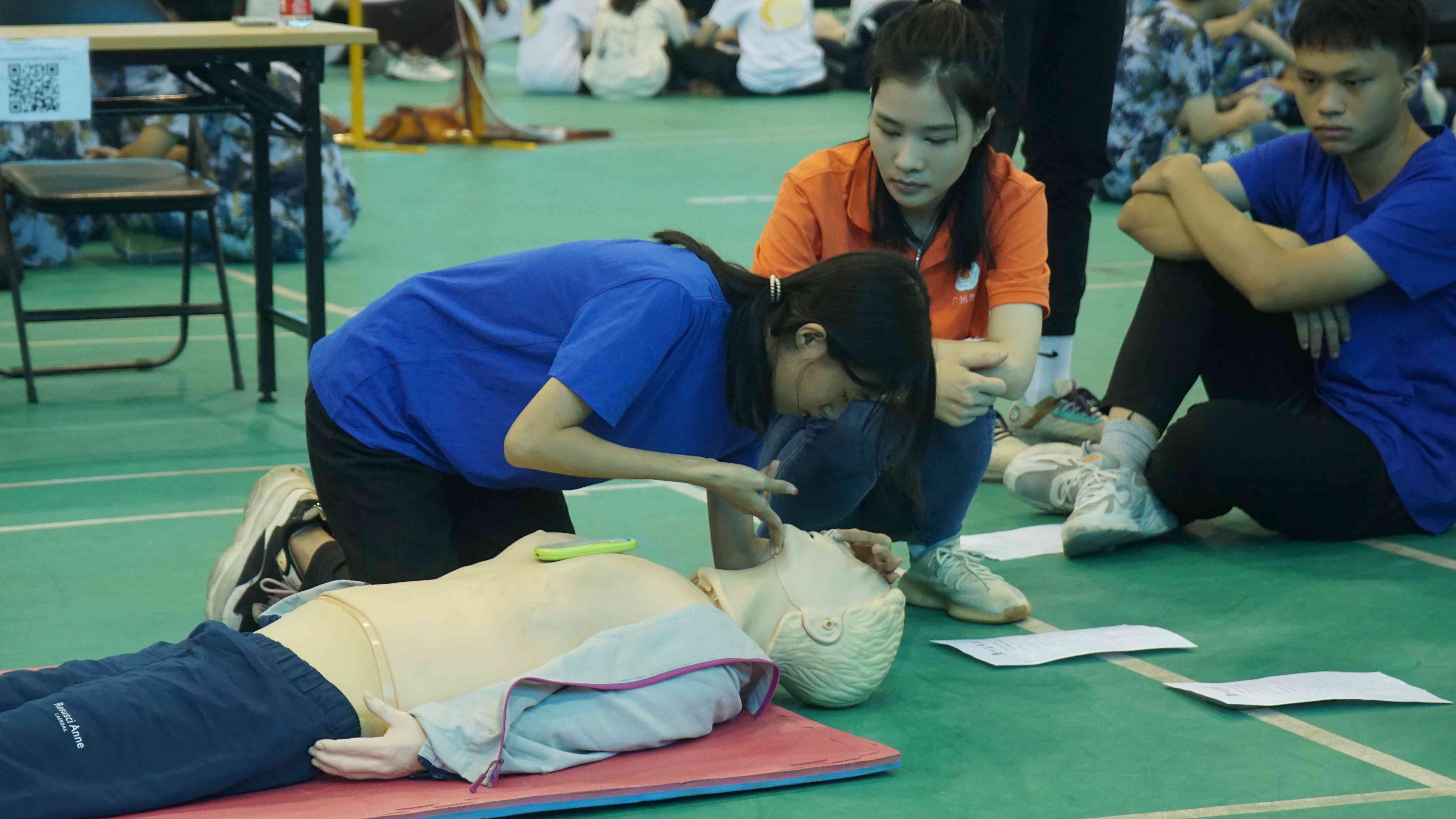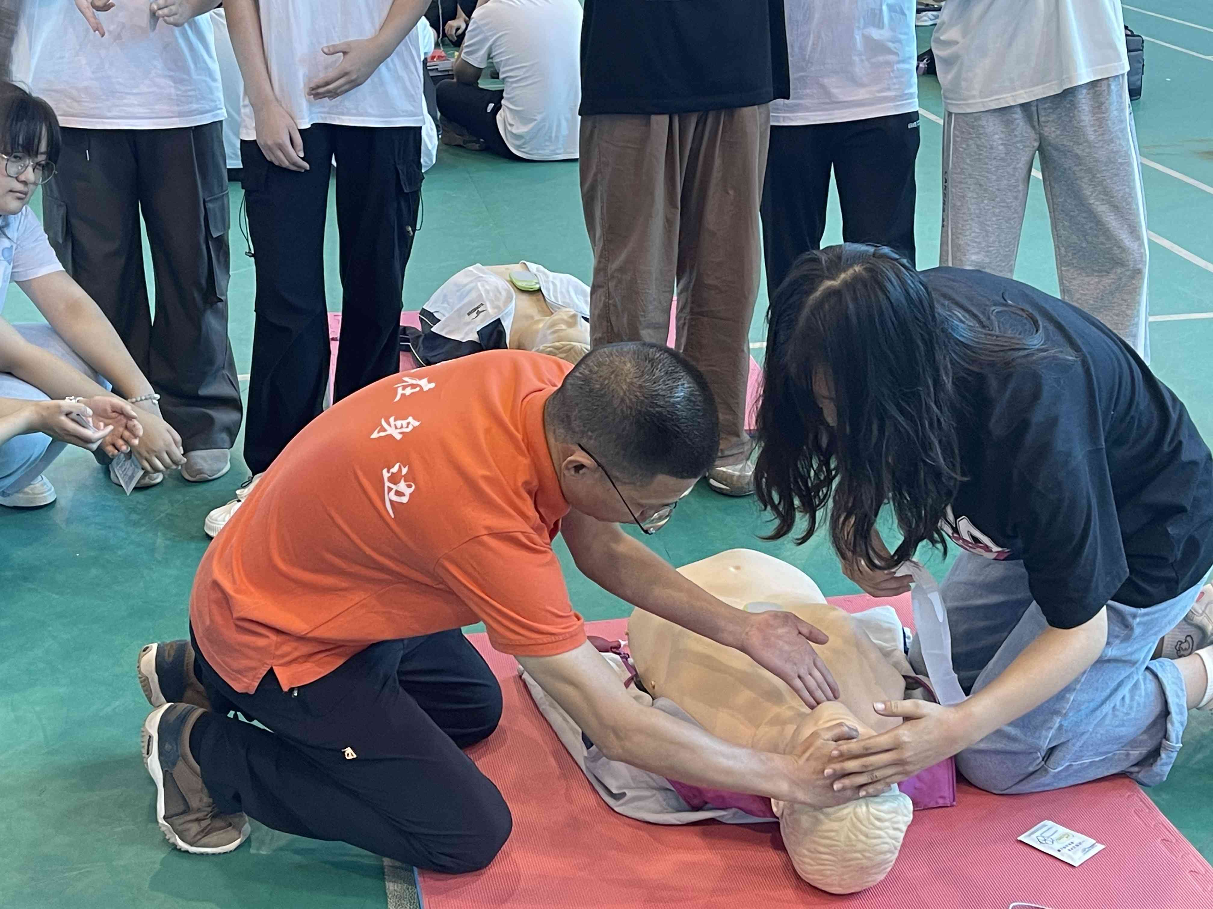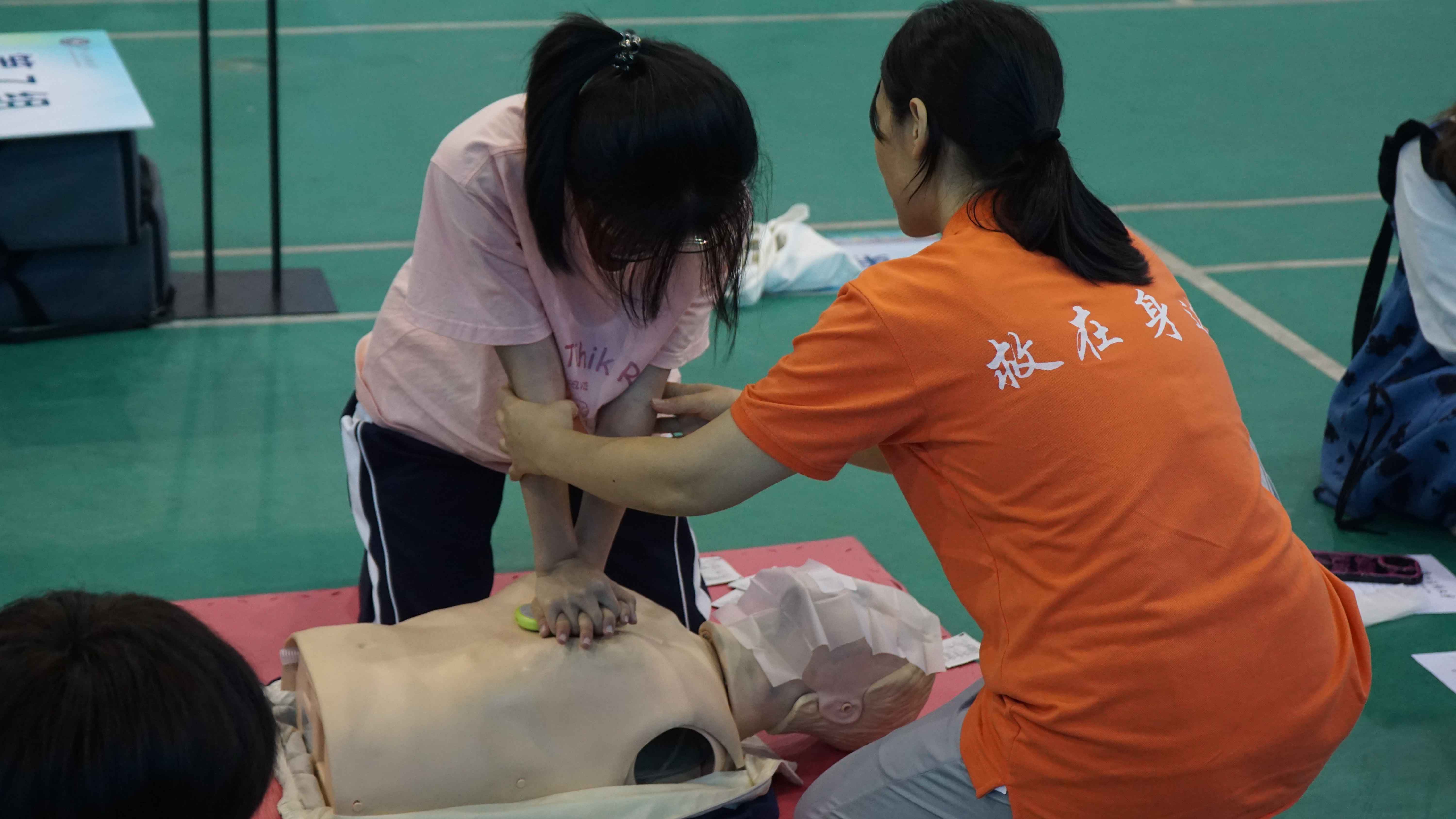实操练习时,老师们对心肺复苏术的操作和AED的使用进行示范,随后带领学生分解实施步骤并讲述操作要点。学生全神贯注聆听老师的讲解,积极参与其中,逐一反复练习;老师手把手指导正确操作,结合心肺复苏反馈仪的实时反馈,及时指导学生改善按压质量。学生们轮流操作结束后,老师对其进行逐个考核并集中点评讲解。