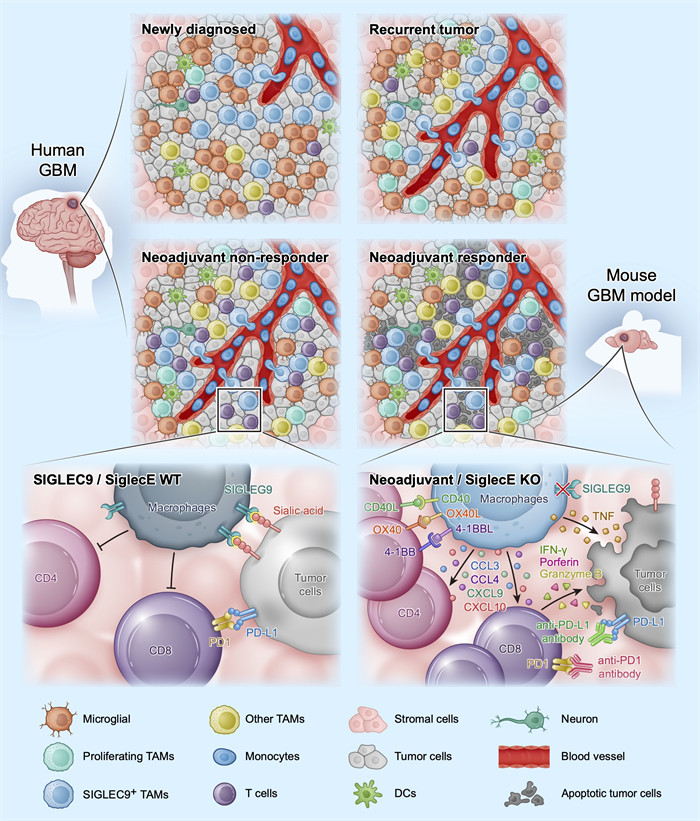 这项研究的发现为胶质母细胞瘤的治疗提供了新的思路,即 Siglec-9是一种新颖的巨噬细胞免疫检查点分子,可以作为靶点以提高针对GBM治疗的抗PD-1/PD-L1疗效。这一研究还显示,将人类临床样本的单细胞分析与小鼠转化研究相结合,可以有效地发现基于新型免疫检查点和新免疫细胞亚群的免疫疗法(图1)。