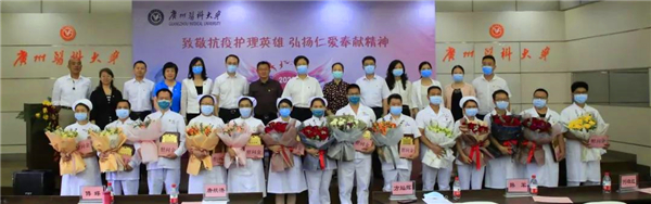 第二部分的致敬和慰问活动由学校工会副主席冯卫东主持。会议播放“广州市抗疫优秀护士故事”视频。出席会议的领导向广医系统16名援鄂抗疫护理英雄颁发致敬牌,并送上慰问金和鲜花。