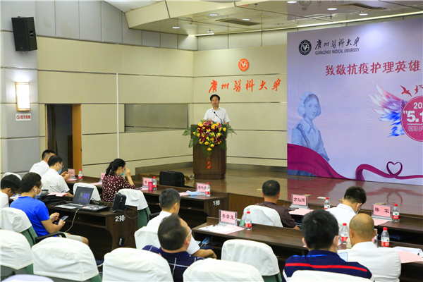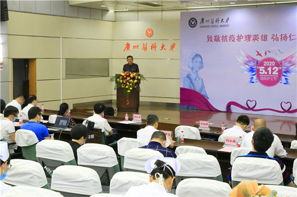 广医在线讯 2020年5月12日,第109个国际护士节,今年国际护士节的主题为“守护世界健康”。当日上午,学校举办“致敬抗疫护理英雄 弘扬仁爱奉献精神”主题庆祝与致敬活动。广州市人大常委会副主任、市总工会主席唐航浩,团市委副书记高洪祥,广州市妇联副主席傅蝶,广州市教育工会负责人韩军等领导,学校副校长、工会主席方灿辉和相关职能部门负责人,各附属医院相关负责人,广医系统全体援鄂护理人员,护理学院师生代表等,在越秀校区主会场参加活动。各附属医院设立分会场集中观看在线直播,护理学院全体学生通过个人终端观看在线直播。