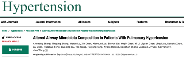 广医在线讯 9月14日,伟德国际英国附属第一医院、广州呼吸健康研究院、呼吸疾病国家重点实验室肺血管病学组在循环领域权威期刊Hypertension(影响因子:7.713,中科院分区:医学1区Top期刊)在线发表了关于肺动脉高压患者咽部微生态菌群组成的研究论文“Altered Airway Microbiota Composition in Patients with Pulmonary Hypertension”。
