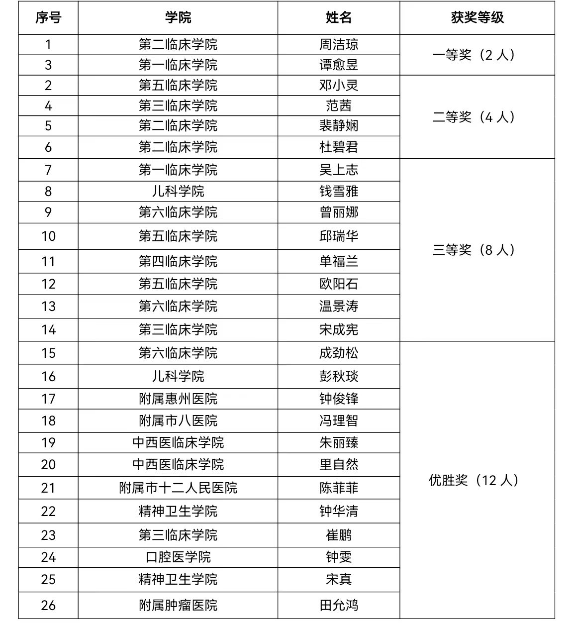 为持续加强临床教师教学意识,规范临床教学病例讨论模式,提升临床教师带教质量和水平,学校自2023年6月起开展2023年临床教学病例讨论竞赛。10月8日,进入决赛的8支队伍在番禺校区进行了激烈比拼,第二临床学院周洁琼、第一临床学院谭愈昱荣获一等奖,两个学院同时荣获优秀组织奖。