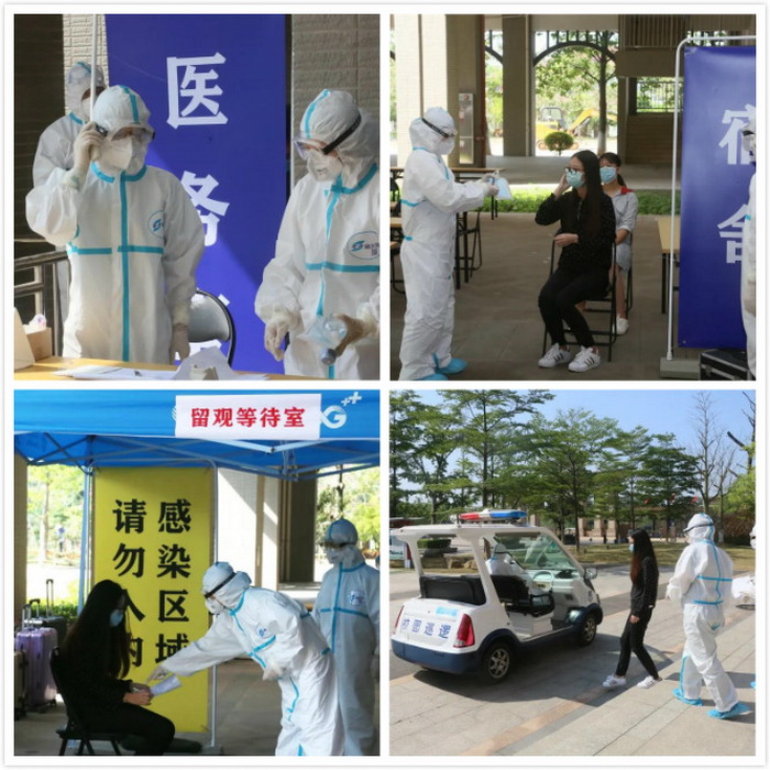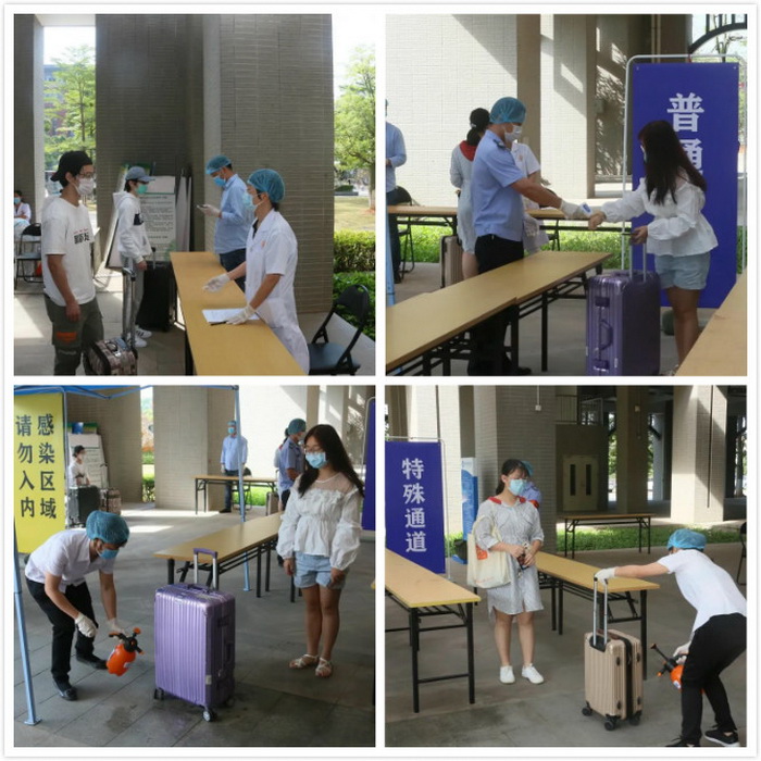 学生有序入校,接受身份核查、测温和行李消毒、手消毒等,来自重点防控地区的返校人员走特殊通道。
