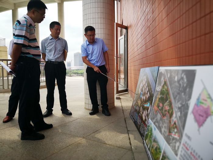 方灿辉副校长向周青峰副主任一行介绍新校区二期工程相关情况