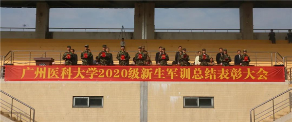 大会进行了分列式和军事表演。各个方队步履整齐、口号嘹亮地从主席台下通过,展示了队列训练的成果。军体拳、短棍术、匕首操、警棍盾牌操、战术演练、“风华队”和全体军训学员的手语操方阵表演,场面既气势恢宏,又充分展现了广医大学子的青春活力。随后,学生工作部部长陈伟民宣读了表彰2020级本科生军训积极分子的决定。学校领导和承训单位、学校有关部门负责人为军训积极分子代表颁发了荣誉证书。