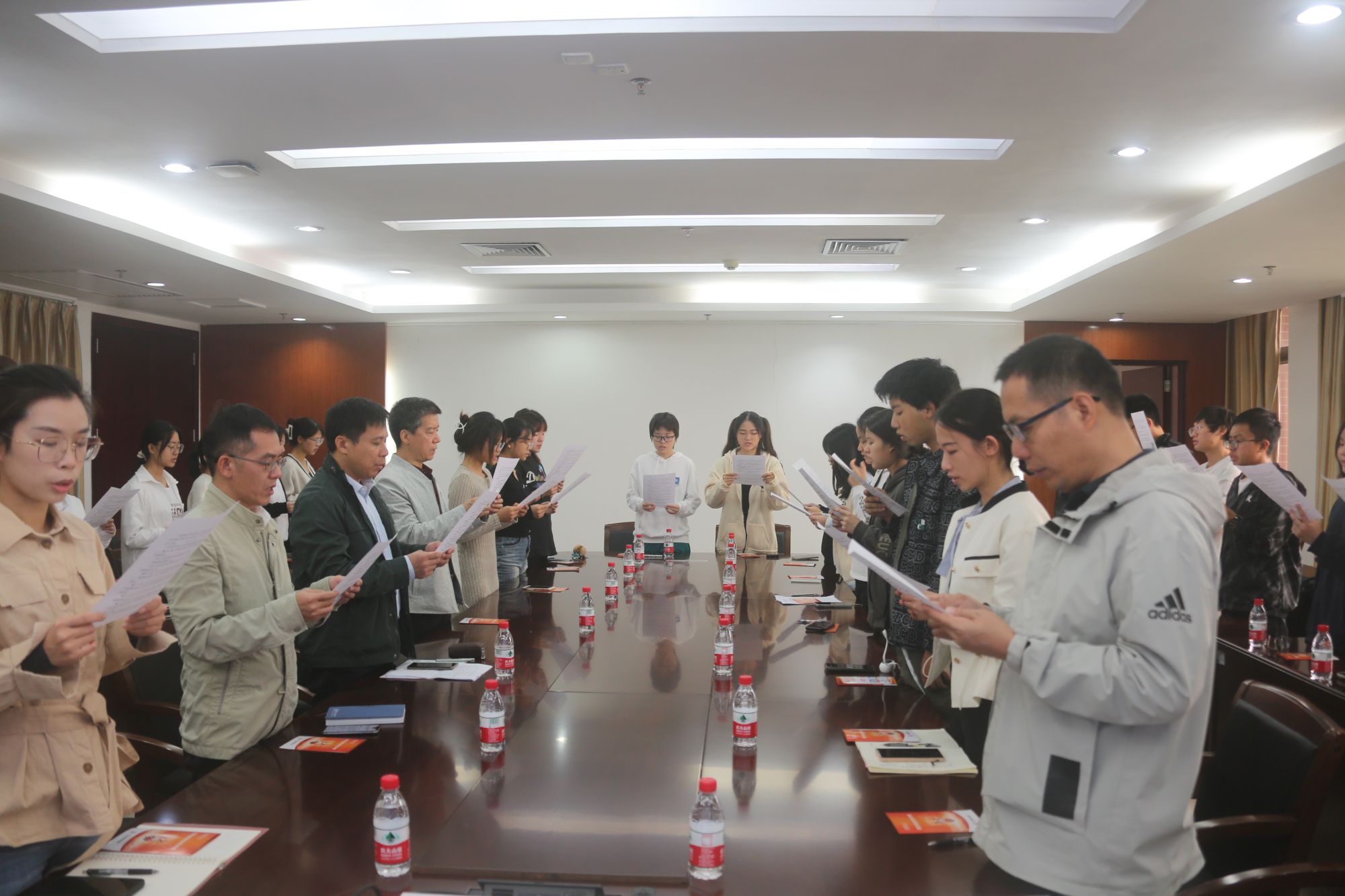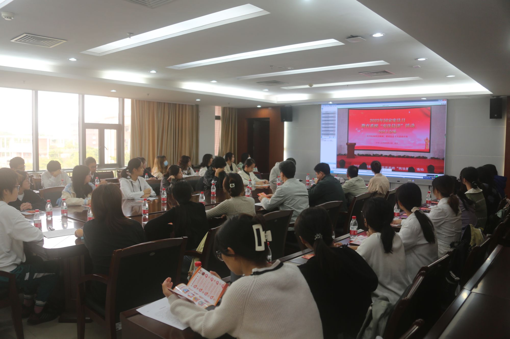 今天是第十个国家宪法日。为深入学习贯彻党的二十大精神,贯彻落实习近平法治思想和习近平总书记关于宪法法治教育的重要指示精神,引导广大青年强化宪法意识,弘扬宪法精神,12月4日上午,伟德国际组织师生代表在番禺校区举行“宪法晨读”活动。部分职能部门负责人、教师代表、学生代表现场参与活动。在晨读环节中,师生代表跟随北京主会场共同朗读了《中华人民共和国宪法》中的部分章节,并聆听教育部领导讲话、观看第八届全国学生“学宪法 讲宪法”演讲比赛获奖选手展演。为进一步增强师生国家安全意识和保密意识,活动现场还同步开展了《中华人民共和国国家安全法》《中华人民共和国保守国家秘密法》等法律的学习宣传活动。
