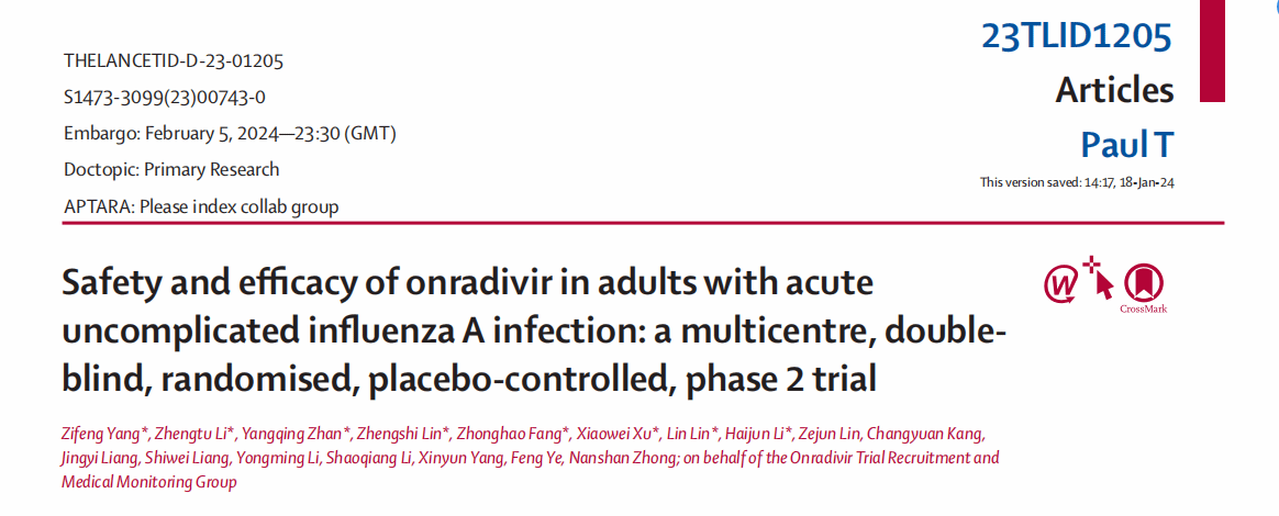 伟德国际英国钟南山、杨子峰团队与浙江大学医学院附属第一医院、广东省中医院和中南大学等单位合作,开展的一项昂拉地韦(Onradivir,研发代号:ZSP1273)治疗成年急性无并发症甲型流感感染的多中心、双盲、随机、安慰剂对照临床II期试验,以考察该候选新药的有效性和安全性,临床试验结果以研究论文“Efficacy and safety of onradivir in adults with acute uncomplicated influenza A infection: a multi-center, double-blind, randomized, placebo-controlled phase 2 trial”于近期发表在医学顶刊柳叶刀子刊《The Lancet Infectious Diseases》,影响因子达56.3。
