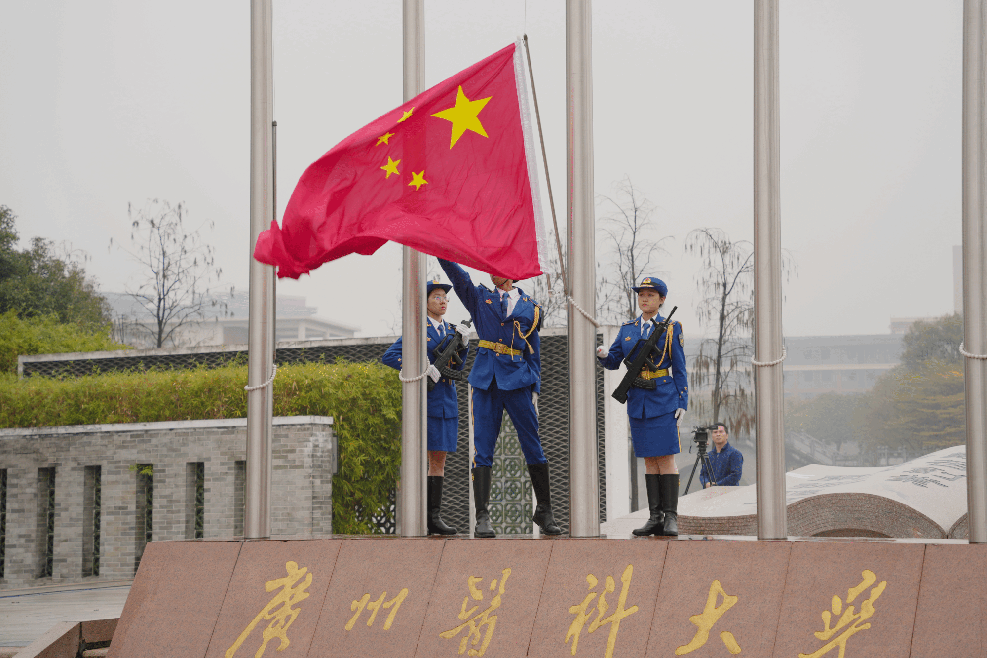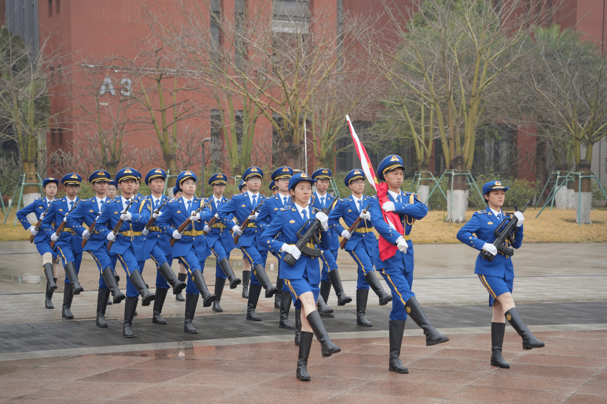国旗护卫队员踏着铿锵有力的步伐,昂首走向升旗台。