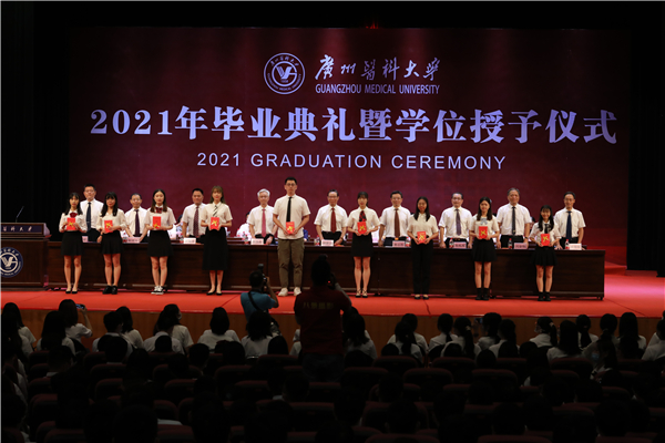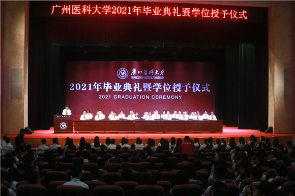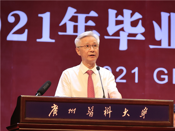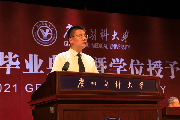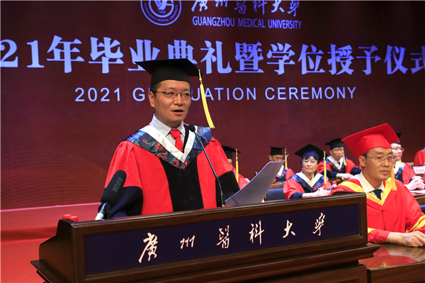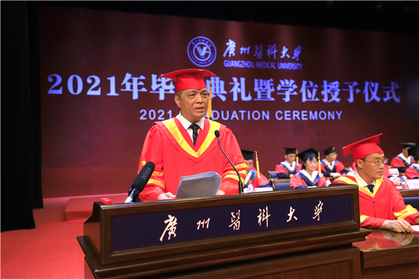 校长冉丕鑫代表学校向毕业生们表示热烈的祝贺和衷心的祝福。在本科生毕业典礼上,他谈到,今年是中国共产党成立一百周年,也是全面建设社会主义现代化国家的开局之年,作为站在“两个百年”历史交汇点的青年,“欣逢盛世,当不负盛世”。希望你们能坚守和践行广医人的理想和担当,坚持与祖国同向、与时代同行,把爱国之情怀、强国之志向、报国之行动统一起来,在服务国家需求中彰显青春价值。他勉励毕业生以敬爱的老校长钟南山院士为榜样,让“南山精神”伴随大家逐梦前行:一是希望你们秉承忧国忧民、敢于担当的家国情怀;二是希望你们坚守严谨认真、实事求是的科学精神;三是希望你们保持孜孜不倦、追求卓越的人生态度。