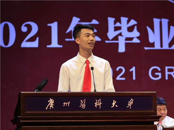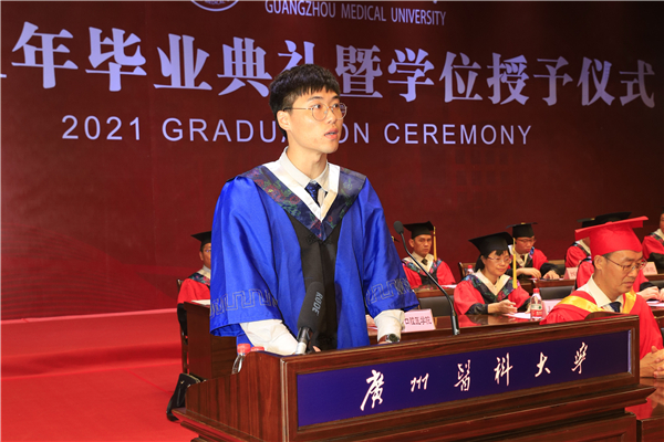 临床医学专业黄浚峰同学和博士生林翱同学分别代表毕业本科生、研究生发言。他们分享了在广医学习生活的感悟与收获,并代表毕业生向师长的培养之恩表达最衷心的敬意与感谢。黄浚峰说:“大胆做梦、勇敢追梦,以‘吾将上下而求索’的坚韧意志为指引,践行广医人精神、南山风格,为祖国医学事业奋斗终生!”林翱说:“在三年的时间里,我们跟着导师锻炼临床与科研能力,更重要的是,母校对我们的培养,将广医人精神深深地刻进我们骨子里。从凤凰花开的路口出发,我们要为祖国医药卫生事业的发展贡献更大的力量。”