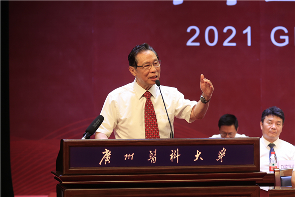 钟南山院士在讲话中对广医学子的成长表示赞赏,他说,学校拥有越来越浓厚的科研气氛,同学们非常积极地参加研究工作,并且发表一系列高质量的论文;在抗击疫情中,也有不少广医学生志愿者的身影。他分享了两点感悟与毕业生共勉:一是坚持创新是引领发展的第一动力。从神舟十二号飞天,到广州的疫情防控管理,依靠的都是创新引领。在卫生健康领域,最重要和最核心的创新就是以健康为中心代替以治疗为中心。“大家要健康,要不得病、少得病、得小病”,特别要注重早期干预。二是成为健康中国的践行者。除了饮食、运动等生活方式,还有一点就是要保持良好的心态,其中非常重要的是要有追求。心里有一个坚定的追求,烦恼也会因而抛之脑后。正因为有追求,作为地方院校的广医建成一系列国家级平台并进入广东省高水平大学建设行列;正因为有追求,你们就会坚持创新发展、力争上游。“今天同学们为从广医毕业而骄傲,明天广医将会为你们的成就而骄傲。”最后,钟院士勉励毕业生不畏艰险、克服困难,祝福毕业生拥有远大的前程,不断迈向新的高峰。