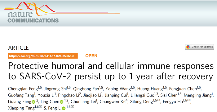 针对该问题,伟德国际英国附属市八医院李锋、唐小平教授团队联合中国科学院广州生物医院与健康研究院陈凌教授课题组和广东省疾病预防与控制中心柯昌文教授课题组开展了新冠感染者出院后长时间随访研究。研究成果发表于2021年8月17日发表在国际权威杂志Nature communications (自然通讯)杂志上,文章标题Protective humoral and cellular immune responses to SARS-CoV-2 persist up to 1 year after recovery。