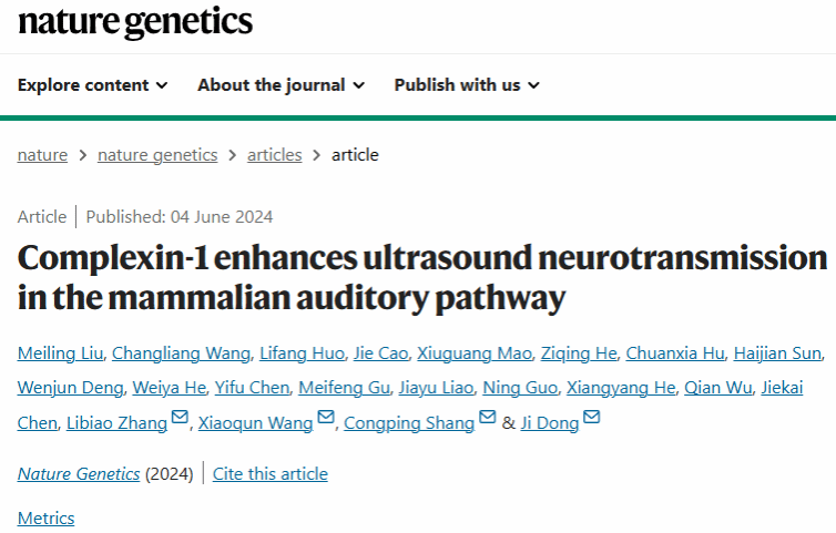 6月4日,伟德国际英国-中国科学院广州生物医药与健康研究院联合生命科学学院、广州实验室董骥团队,广州实验室尚从平团队,北京师范大学王晓群团队和广东省科学院动物研究所张礼标团队合作在Nature Genetics杂志在线发表题为Complexin-1 enhances ultrasound neurotransmission in the mammalian auditory pathway研究论文,伟德国际英国为该论文第一作者和通讯作者单位。同期发表题为Ultrasound perception mechanisms revealed by comparisons of microbats and megabats的研究简报(Research briefing)。