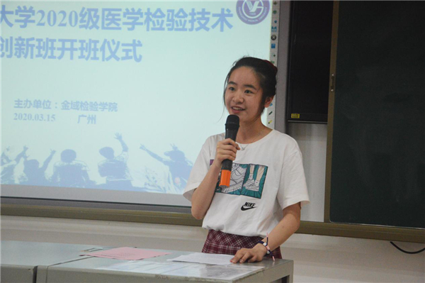 2020级黄楠同学代表创新班学生发言,她感谢学院能为本科生提供创新班这个平台,并表示今后将与班集体一起积极进取,奋力拼搏。