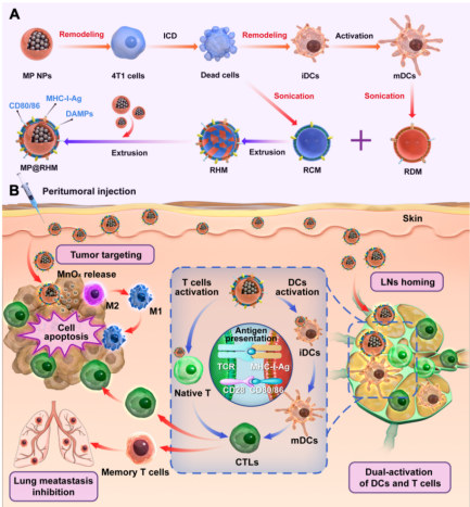 这是国际上首次利用氧化锰重塑自体肿瘤细胞和DC细胞(实现个体化肿瘤治疗的特点)以构建锰基多功能仿生纳米疫苗,用于个体化的实体肿瘤治疗,为肿瘤疫苗的构建提供了新策略。