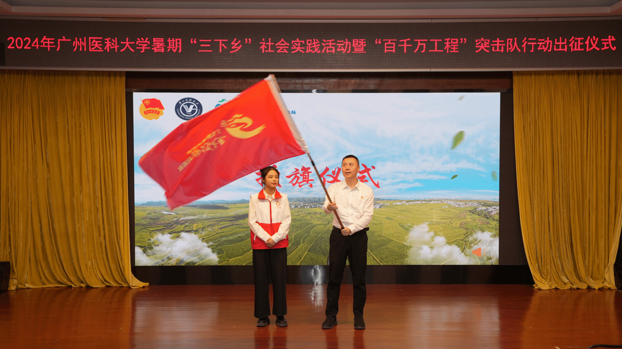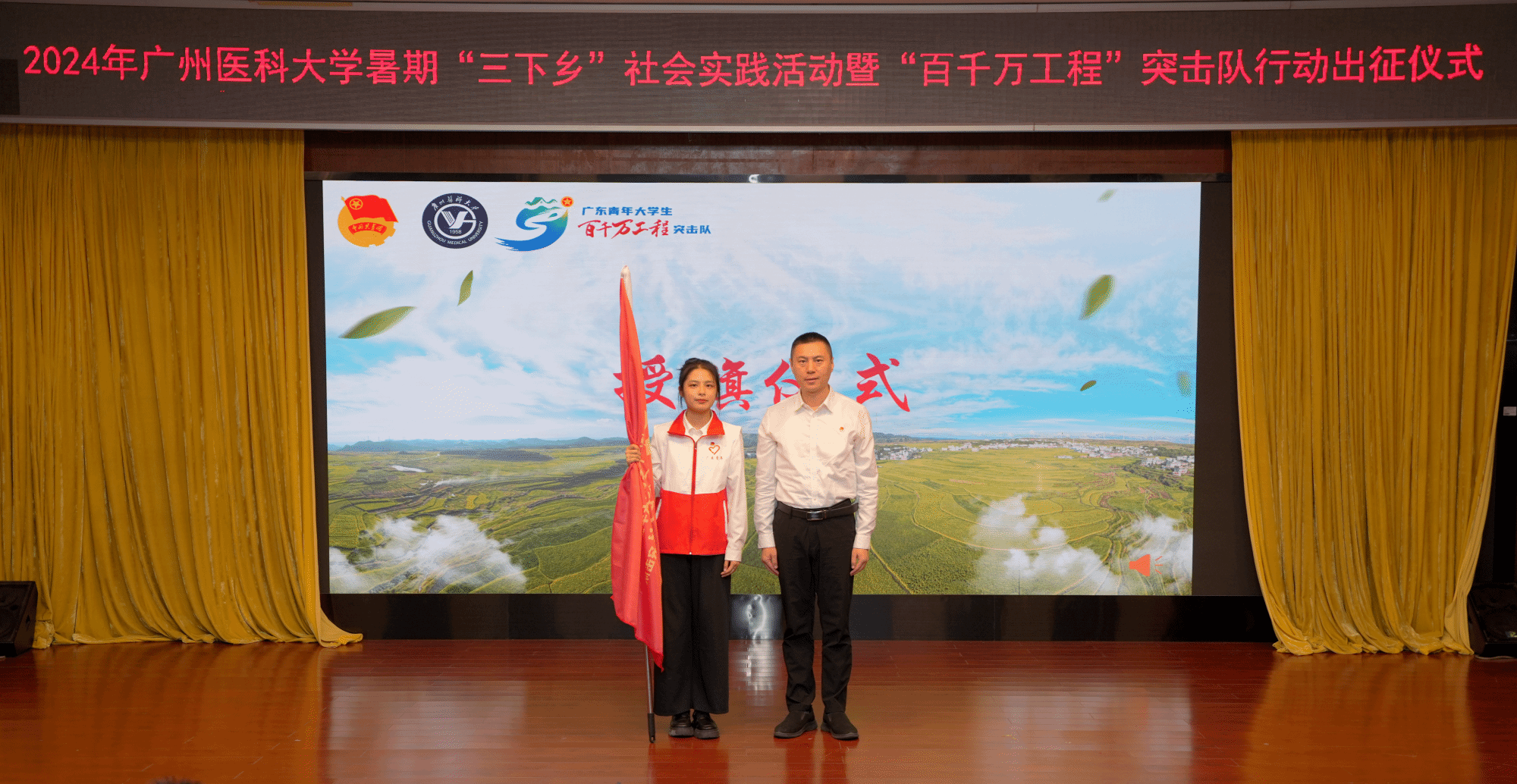 2024年伟德国际英国“百千万工程”突击队行动学生代表吴依然同学从团广东省委副书记范春手中接过旗帜,象征着全校82支“百千万工程”突击队集结完毕,广医青年即将于暑假期间奔赴各地,通过社会调研、健康课堂、瑶药创新、非遗传承、专业实践等方式助力广东高质量发展,奋力书写为中国式现代化挺膺担当的青春篇章。