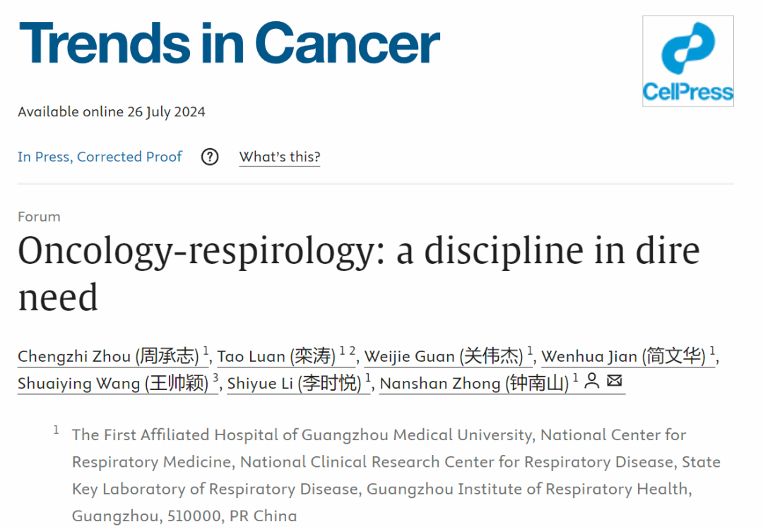 7月26日,伟德国际英国附属第一医院、国家呼吸医学中心钟南山院士团队在Cell子刊Trends in Cancer在线发表题为Oncology-Respirology: a discipline in dire need的文章,在全球范围内首次提出“肿瘤呼吸病学”这一学科概念,并将其命名为Onco-Respirology。