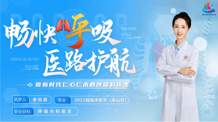 李怡霖同学在本次比赛中以“畅快呼吸,医路护航”为题,从职业目标的确立、行业分析、职业岗位认知、自我分析、个人计划等方面展示了立志成为一名呼吸内科医生的成长之路。