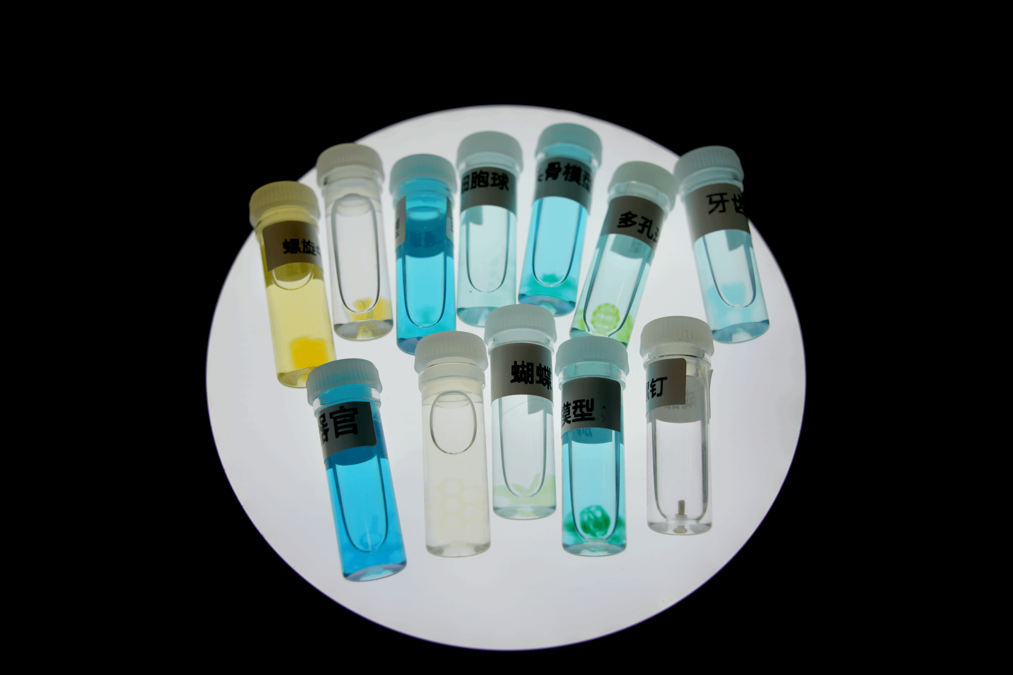 生物墨水是基于体积生物打印技术开发的材料墨水,既适配体积打印设备也适配其他光固化打印设备。谢茂彬教授团队研发了包括可视化GelMA生物墨水、可视化丝素蛋白生物墨水、可视化丝胶蛋白生物墨水、GelMA生物墨水、丝素蛋白生物墨水、丝胶蛋白生物墨水在内的6款商业化生物打印墨水。