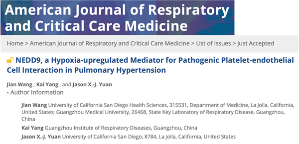 3月26日,肺血管病学组在呼吸领域权威期刊Am J Respir Crit Care Med(医学1区Top期刊,影响因子:17.452)在线发表了题为“NEDD9, a Hypoxia-upregulated Mediator for Pathogenic Platelet-endothelial Cell Interaction in Pulmonary Hypertension”的社论。王健教授为本文的第一作者,美国加州大学圣地亚哥分校Jason X.-J. Yuan教授为通讯作者。