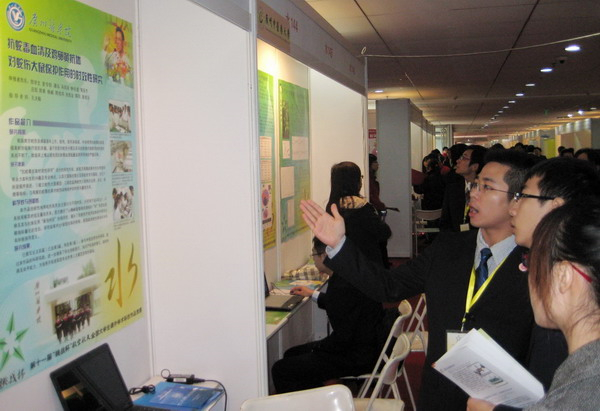 广医学生多次在全国“挑战杯”竞赛中获得好成绩,图为获得国家二等奖的参赛项目负责学生在现场介绍项目情况。