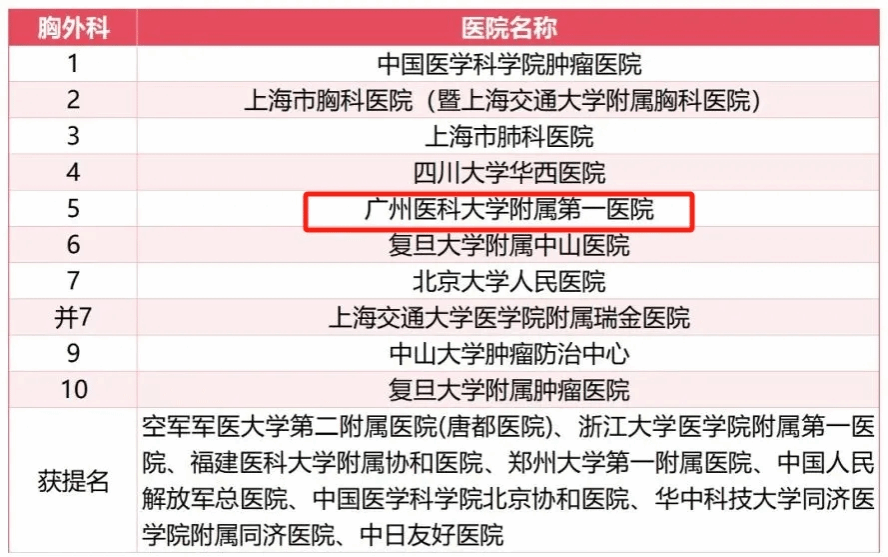除了位居榜首的呼吸科以外,附属第一医院变态反应科排名全国第5,胸外科排名全国第5;附属第二医院变态反应科排名全国第7;附属脑科医院精神医学排名全国第7;附属妇女儿童医疗中心(广州市妇女儿童医疗中心)小儿外科排名全国第5、小儿内科排名全国第7、罕见病排名全国第8。此外,获得专科声誉排行榜提名的有附属第一医院重症医学、泌尿外科和附属第二医院疼痛学。