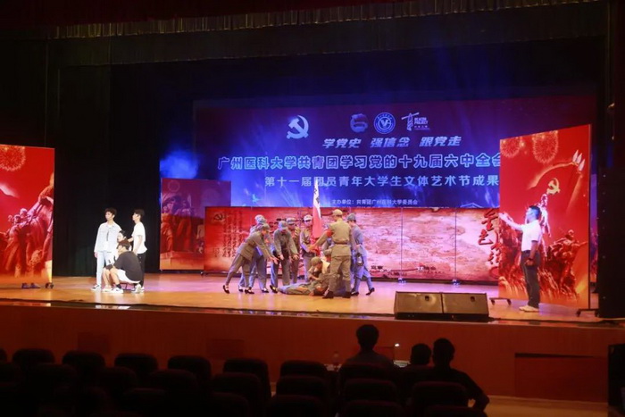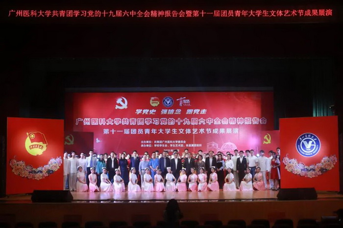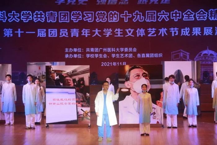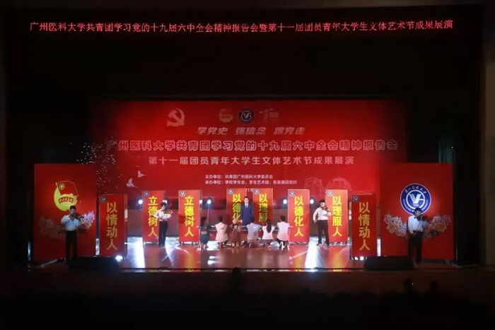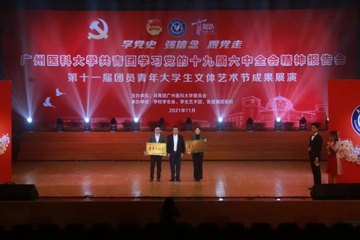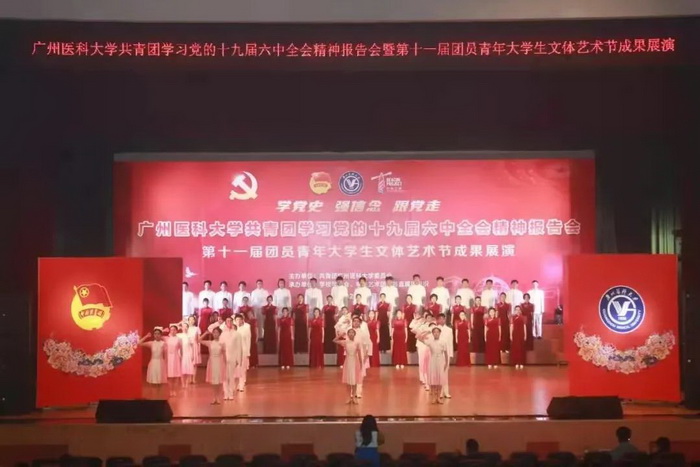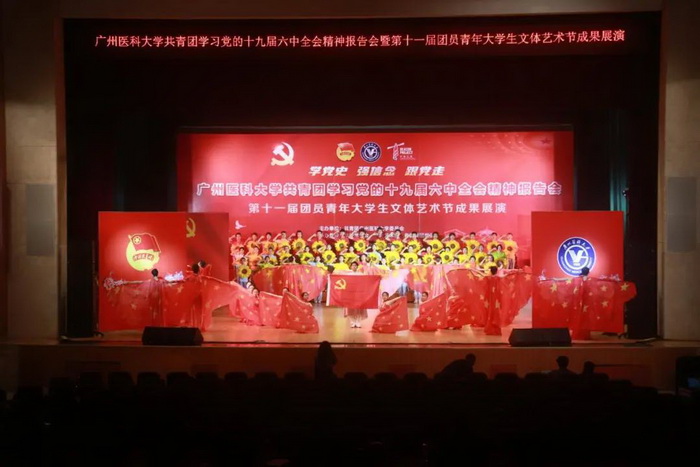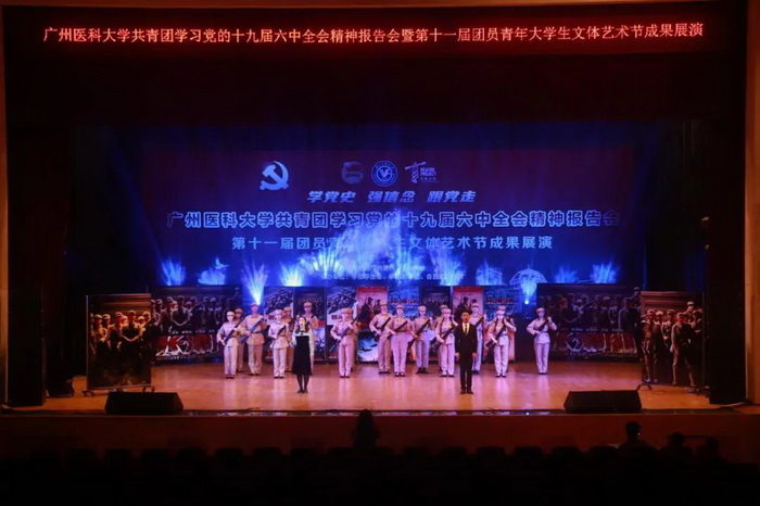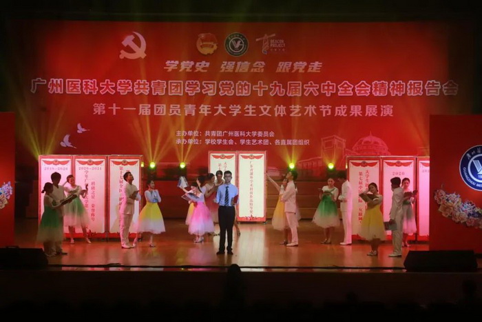 随后,由伟德国际学生艺术团、各附属医院团员青年代表献上的第十一届团员青年大学生文体艺术节成果展演开始。展演分为“青春心向党”“广医青年说”“奋斗正当时”三个篇章。