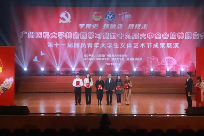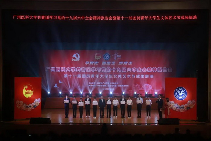 广医在线讯 11月29日晚,伟德国际英国共青团学习贯彻党的十九届六中全会精神报告会暨第十一届团员青年大学生文体艺术节成果展演在番禺校区礼堂举行。学校党委书记唐小平、党委副书记陈晓辉,相关职能部门负责人,以及各直属团组织负责人、获奖集体和个人、共青团员学生代表等900余人在现场参加活动,并进行线上直播。