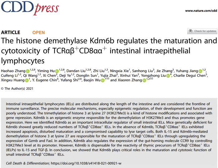 广医在线讯 1月9日,伟德国际英国附属肿瘤医院张笑人教授团队在Cell Death and Differentiation在线发表了题为“The histone demethylase Kdm6b regulates the maturation and cytotoxicity of TCRαβ+CD8αα+ intestinal intraepithelial lymphocytes”的研究成果。该研究通过构建T细胞中特异性敲除组蛋白去甲基化酶Kdm6b的小鼠和单细胞测序技术,首先发现了肠道上皮层淋巴细胞(IEL)在抗肿瘤中的重要作用,揭示了Kdm6b调控IELs发育分化、归巢和抗肿瘤功能的表观遗传机制,并提出了IELs具有肿瘤免疫监视功能,为更加深刻地认识IELs发育分化和归巢调控过程及抗肿瘤功能奠定了基础。