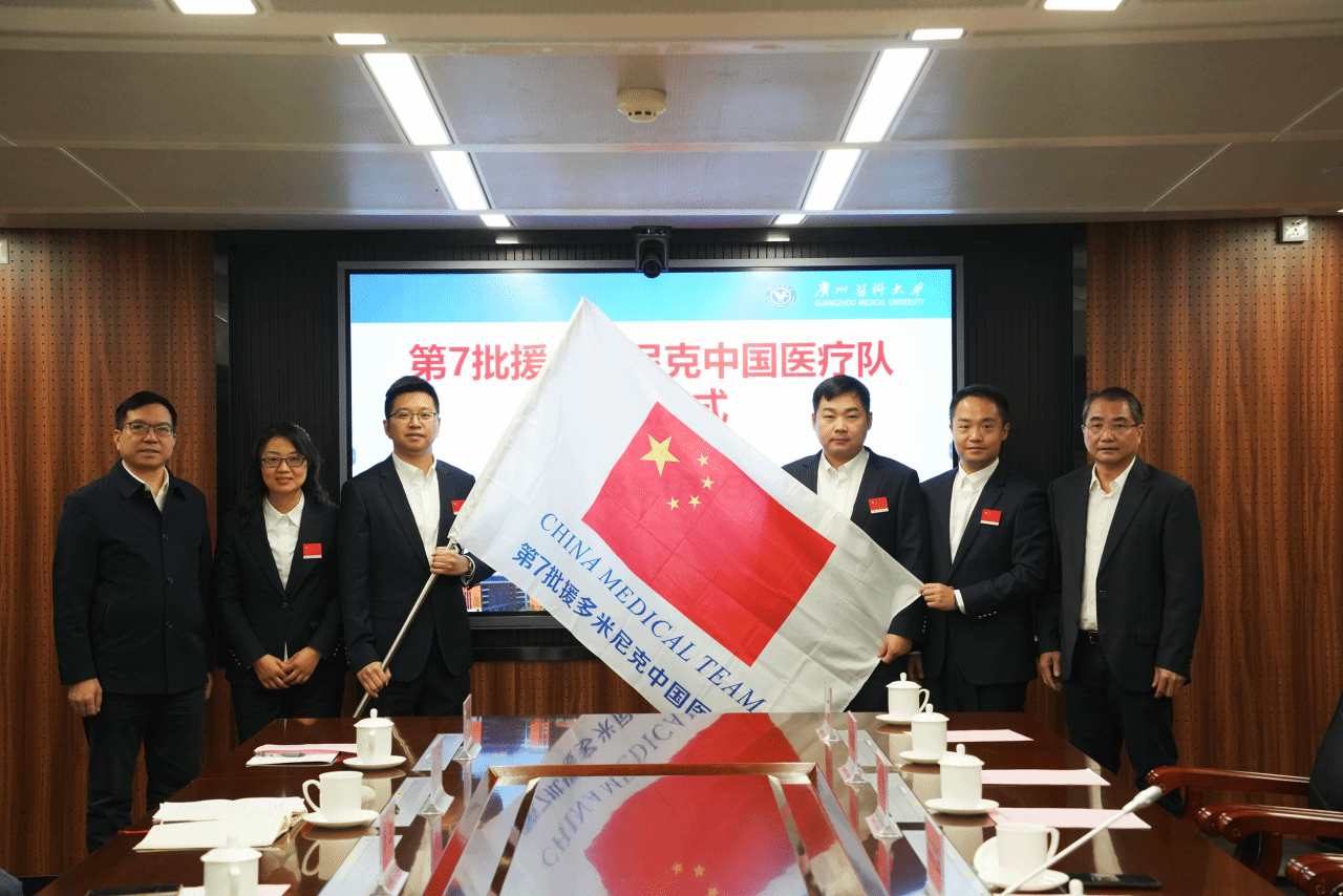 在医疗队即将出发之际,省民营医院和卫生社团组织联合党委专职副书记邓林峰向第7批援多米尼克中国医疗队授医疗队队旗。