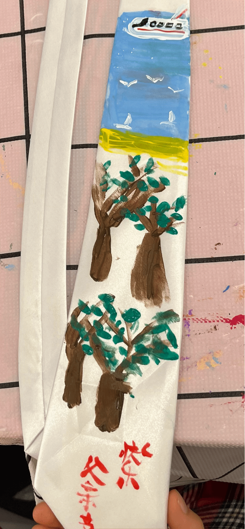 广医三院泌尿外科邓楠:“我的行李主要带了一些个人物品和给外方的礼品,其中对我来说有一件比较有意义的物件,那就是去年父亲节,我儿子给我手绘的一条领带。”