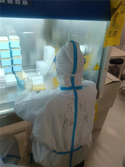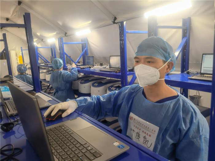 “刚开始我的工作是在扩增舱,就是把样本都放进扩增仪和分析结果。由于自己长期在PCR工作,所以工作比较得心应手,很快适应了这里的节奏。后来由于加样舱缺人,我自告奋勇来到加样舱,标本量巨大,时效性非常强,工作压力更大了。经常连续奋战六个小时,我练就了‘飞速拧盖’的本领,最多一夜可以单手拧2800多个标本。”叶俊凯介绍。